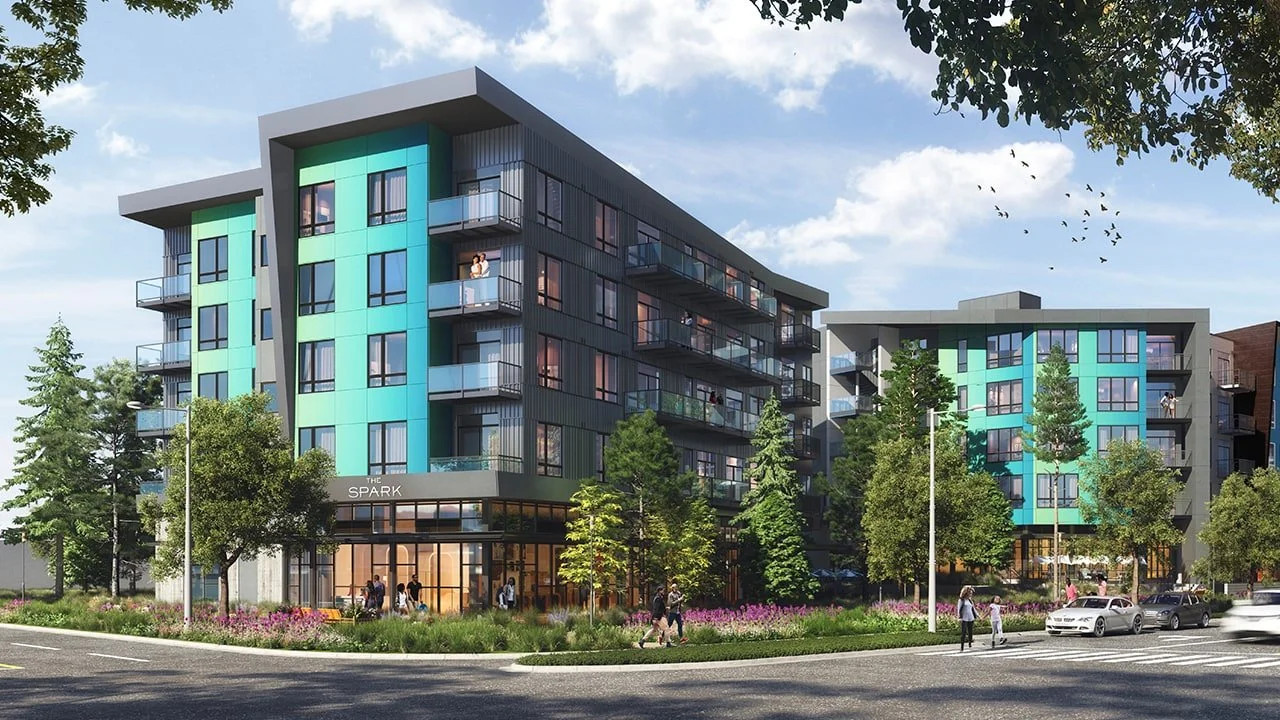 The Spark is a mixed use project housing 207 residential units across two distinct buildings, atop a podium of parking, retail, and amenity spaces.