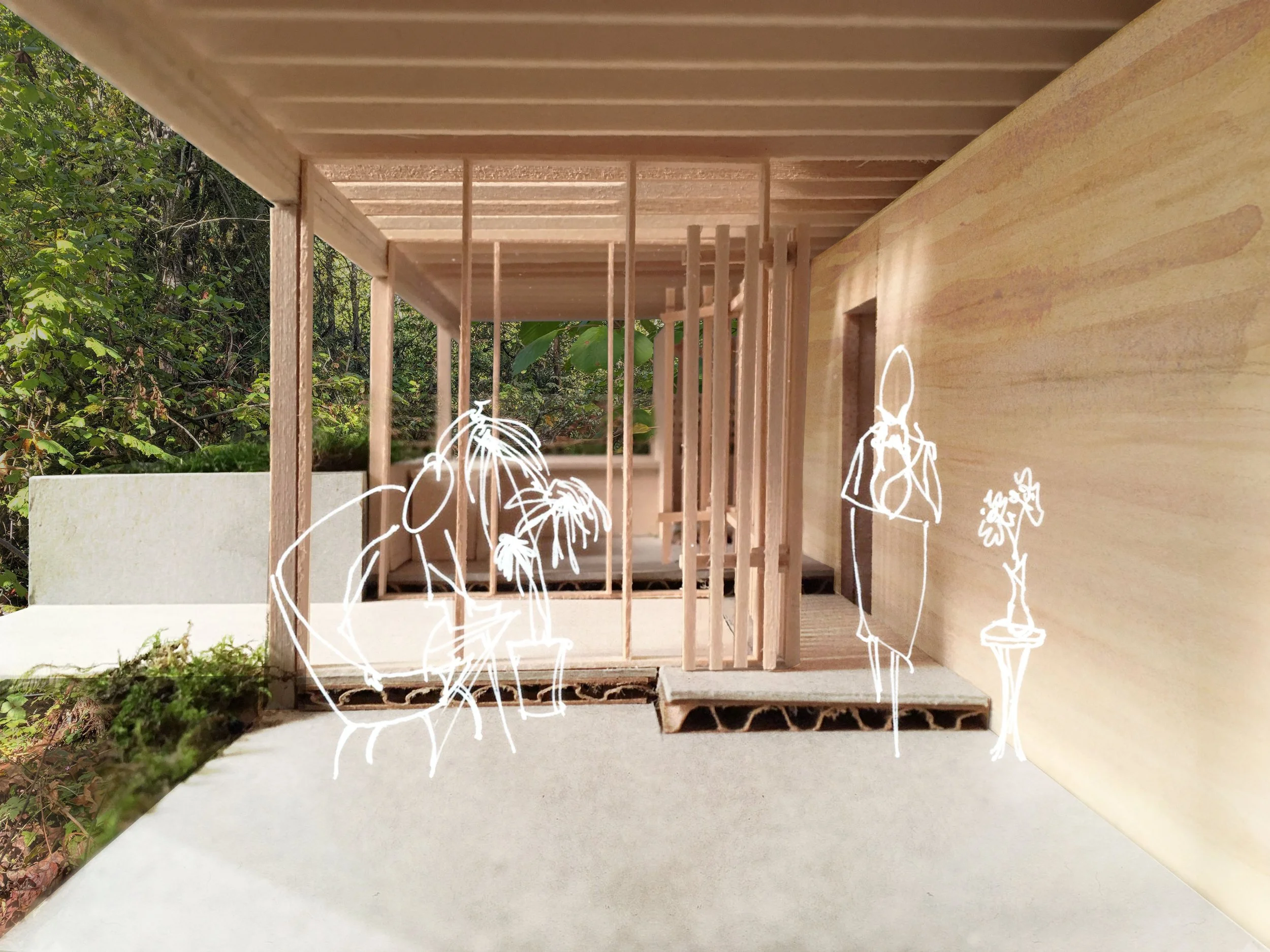 This sketch initiated an idea of embracing the new condition of being under the canopy on the site. Focusing on textures above and below and making more lateral moves in the design.