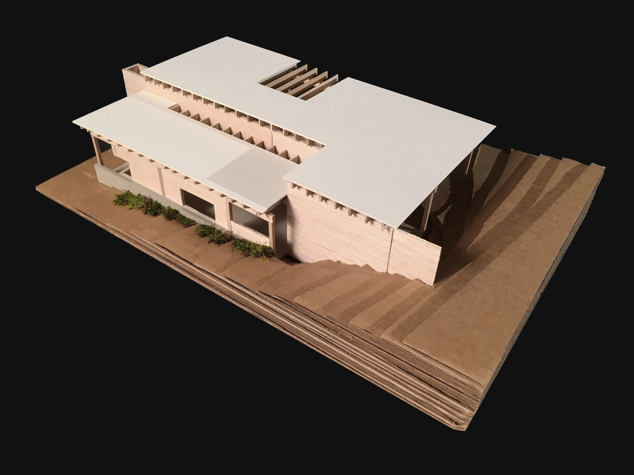 Conceptual model experimenting with walls as the system for creating interior, exterior and shared circulation that interlock in an intuitive manner to create a sense of exploring under the canopy on the site.